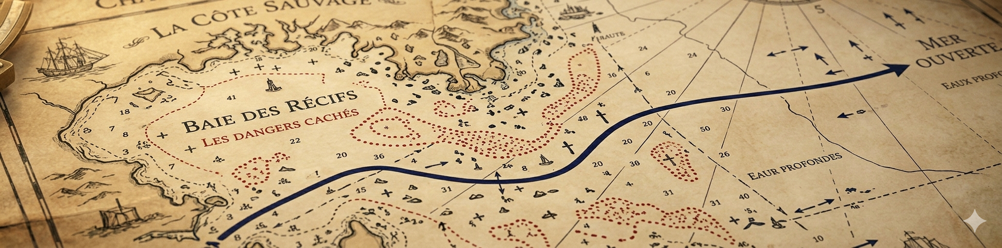 Carte nautique ancienne montrant une route balisée entre des récifs et zones de danger, illustrant la navigation entre les écueils RGPD dans un programme d'incentive commercial.